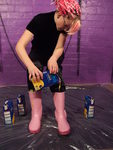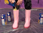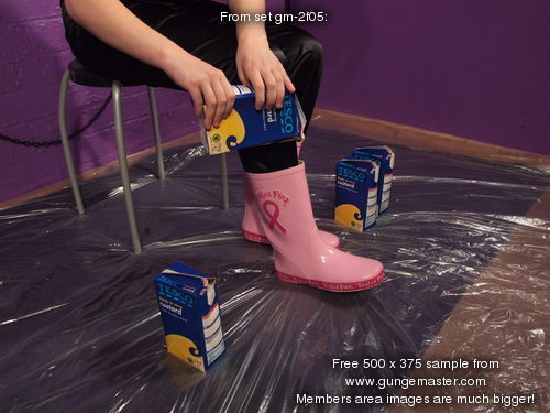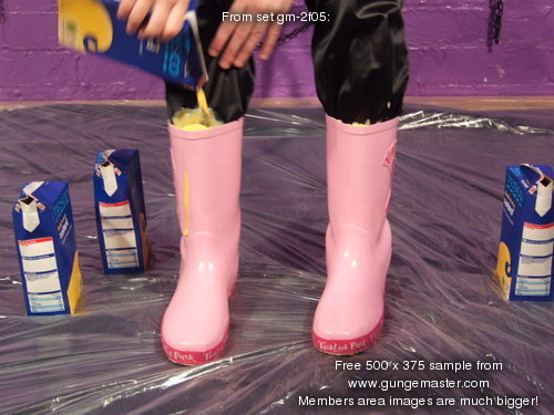 She started with her boots, carefuly filling them to the brim, wiggling her feet as they filled up to let any trapped air escape. Next, she pulled out the waistband of her lovely shiny black party trousers, and emptied three litres of custard down the inside, the thick yellow fluid flowing heavily down both legs and collectng where the trouser legs were tucked into her already-full boots.