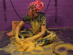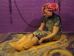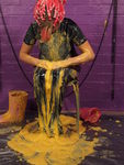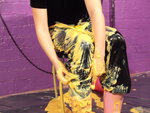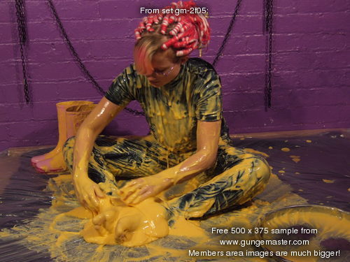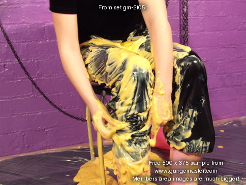 Now it was time to take a seat - in a tray filled with more custard, leaving a perfect circle of yellow slime on Miss Pink's bottom and legs as she stood up again to inspect the damage. Then it was back down into the tray of mess she went, taking a large jug and pouring the contents all over her lap, using her bare hands to gently caress the mixture all over the remaining clean areas of her trousers until they were utterly drenched in yellow wetness.