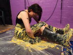 Next she makes custard hand-prints all up the front of the dress, before placing a pair of prints on her silk-clad bottom.