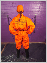 Once her prisoner is properly secured to the wall, the ultra-strict prison warder sets about her work. She has a bucket of liquid black, and this is poured, one beakerful at a time, into the collar of Lady Jasmine's uniform overalls, the thick black fluid flowing smoothly over her skin beneath the orange cotton, gradually staining and soaking through the fabric from within.