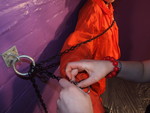 First we see her ladyship being chained to the wall shackles, secure steel chains wrapped round her wrists and another attached to the slave collar on her neck. Then more chains are wrapped round her booted feet, ensuring she can't move at all. Though from the smile on her face you'd never guess that this is supposed to be a punishment...