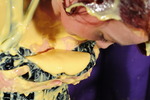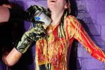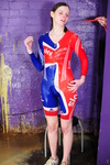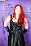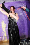 Clara wears a red, white, and blue Sky Sports cycling skinsuit, while Morgana wears her floor length black PVC everyday Dominatrix dress, which is well worn from numerous wearings and gungings. Clara is securely chained to the dungeon wall, and Morgana sets about her with treacle, custard, and rice pudding. Once Morgana thinks Clara has learned her lesson, the dominatrix unchains her and then orders her to gunge the mistress, ensuring the job is done thoroughly and with plenty of gunge poured inside the back of Morgana's dress.