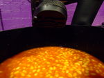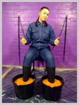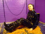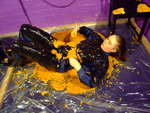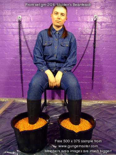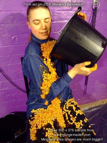 First she plunges her boots into two large buckets of beans, then takes them out, lifts the buckets one at a time, and pours the contents all over herself in an absolute tide of goo.