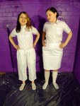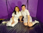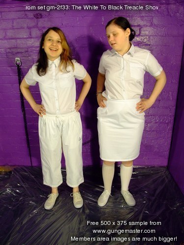 So Wendy and Felicity find themselves in the dungeon, both dressed in pristine white, ready to test how two potential uniforms perform when subjected to gallons of thick black treacle!