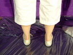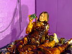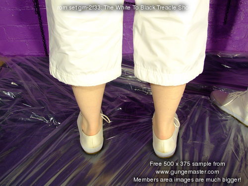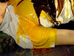 The ladies test each other's outfits very thoroughly indeed, Felicity has treacle poured into her trousers both front and back, till it drips from the leg-bottoms and pools on the floor at her feet, then she has her shirt filled, her back covered, and finally the entire outfit covered all over.