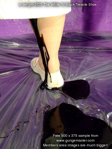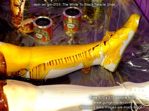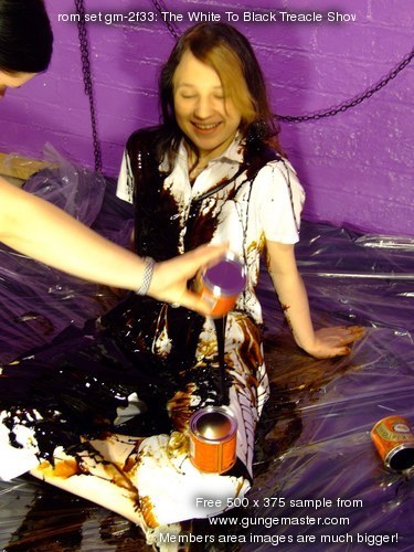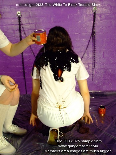 Then it's Wendy's turn, she lies down, her skirt and shirt all white and pristine, and Felicity slowly and carefully destroys Wendy's entire outfit with treacle and syrup. Her shirt suffers first, then her skirt, and once both are completely coated, her socks and shoes suffer the same sticky fate.