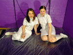 Both women then relax on the floor, both totally coated in syrup and treacle. Both uniforms appear to have passed the gunge test, so perhaps the new spa will have to use both styles!