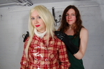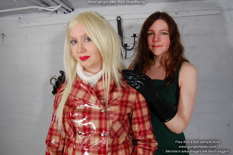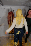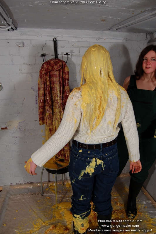 Custard sitting is next, Chastity prepares one of our trademark silver trays full of custard, adding some broken flan base remains for good measure, and Prudence obediently sits down in the mess, coating the seat of the PVC coat in more custard. She initially sits facing away from us so we can watch her lowering her bottom into the gunge, then stands up to show off the damage, before coming round to the front and sitting down again, the better for Chastity to pour lots of custard over her shoulders and down her front, from where it collects in a pool in her lap. She makes no effort to protect her long blonde hair during any of this, so while the coat is so far protecting her jeans and jumper from the steadily increasing mess, her hair starts to get quite messy too.