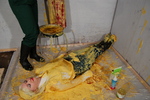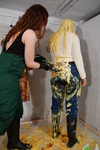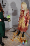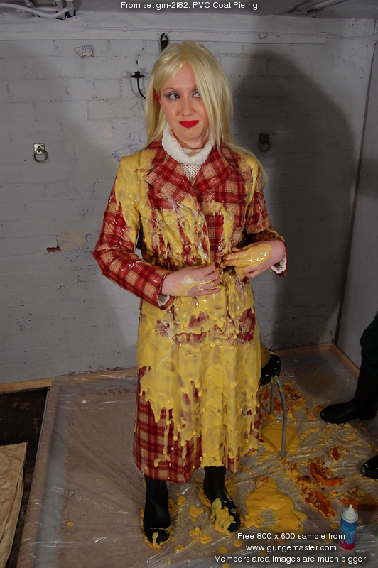 Eventually, she lays the coat down on the floor, pours and walks gunge all over the inside, and then puts it back on over her gunge-drenched clothes, posing to show her very messy self off before retiring to be hosed down, still dressed in mess-drenched clothes. The last 37 photos show the hosedown.