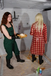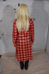 Prudence dresses in a totally 70s style for the session, putting on classic blue jeans and a white poloneck jumper, with black wellies for her feet, before neatly closing the press-studs of her lovely red tartan double-breasted rain coat. And then she meekly stands in the dungeon, and takes her pies like a woman, a Saturation Hall woman that is, enjoying every moment as more mess is splattered and mashed onto her coat.