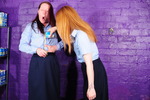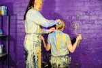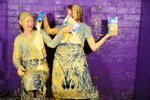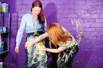 Turn by turn they gradually reduce each other to messy ruin, with custard poured inside underwear, down inside their skirts, filling their boots, inside their shirts, slathered all over the outside of their outfits, sitting in custard filled trays, and finally giving each other very thorough custard shampoos all through their beautiful free flowing long hair.