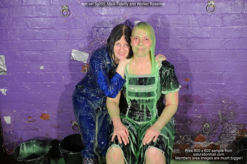 First, Rosemary carefully covers, and then fills, Fidelity's dress and boots, until she's completely drenched including full hair coverage. Then she, still mostly clean and dry, calmly takes a seat and allows the gunge-drenched Fidelity to completely get her own back, covering and filling Rosemary's boilersuit, making her sit in a tray of gunge, and completely covering her hair too.