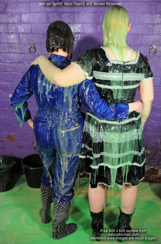 Fidelity is wearing a beautiful satin finish black maid's dress with lots of pretty white trim, plus cute black leather boots with fluffy interiors, while Rosemary is dressed in a blue boilersuit over a black swimsuit, with dark blue wellies with pink spots. They've met up in the dungeon where there are four buckets of freshly made warm gunge, and they are going to thoroughly drench each other in goo!
