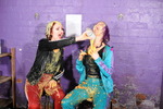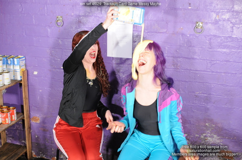They've deliberately dressed for their impending messing, in sportswear that will really show the effects as the gloop is poured on and in, but still look good clean, and great messy! Lady Jennifer wears an entirely matching full tracksuit in turquoise with pink details and a purple hood, which exactly matches her purple hair. She wears black and white trainers. Honeysuckle wears red tracksuit trousers with a black tracksuit jacket, and black converse-style basketball boots. They both wear swimsuits under their tracksuits, and know they'll be having those filled, soon enough!